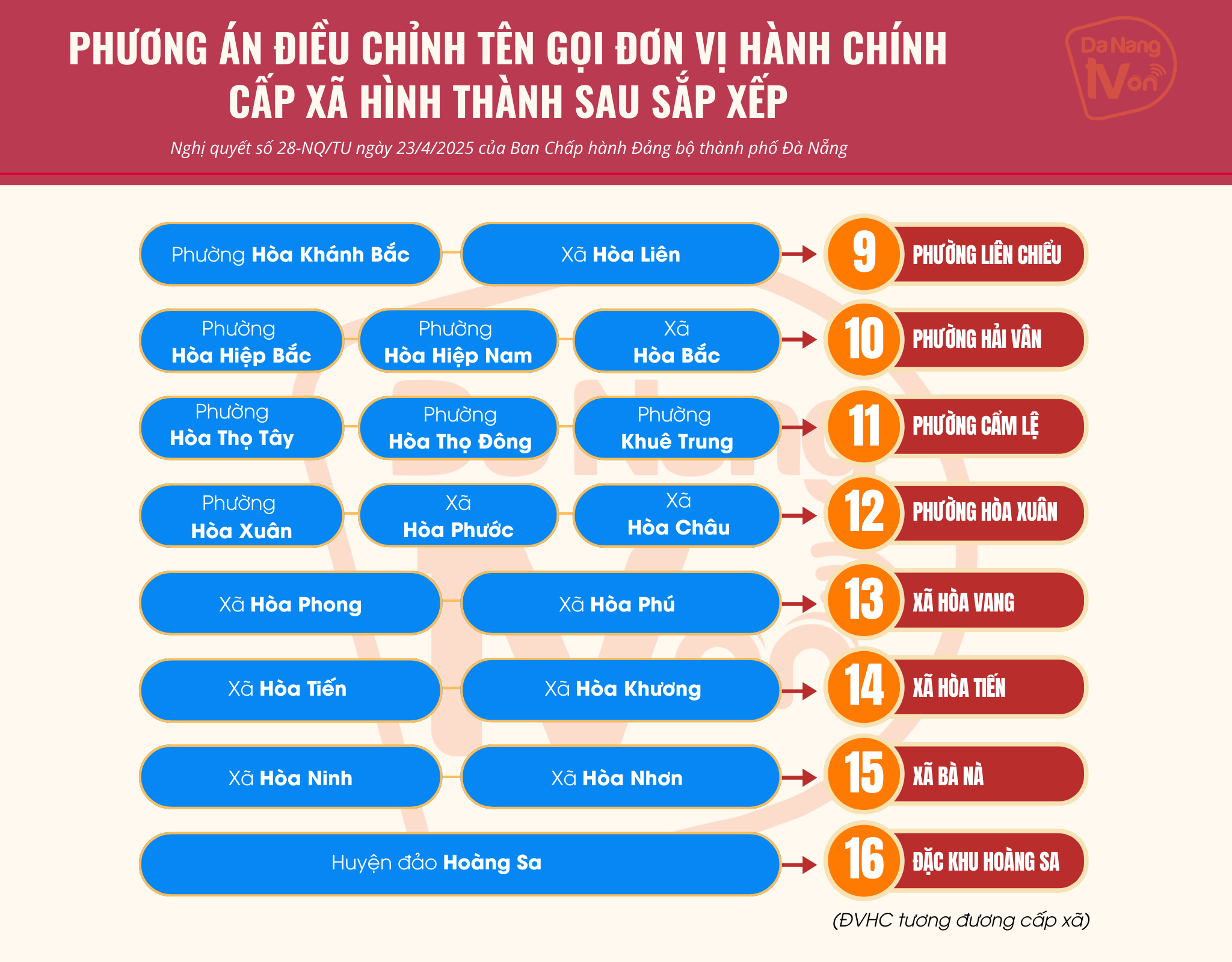 Theo đó, Thành ủy Đà Nẵng chủ trương giảm từ 19 đơn vị hành chính xuống còn 16 đơn vị hành chính cấp xã (bao gồm 12 phường, 03 xã và 01 đặc khu). Cụ thể như sau: