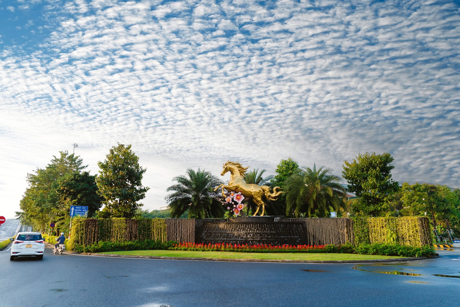 Từng đường nét từ bờm ngựa đến cơ bắp đều được chăm chút tỉ mỉ từ hàng trăm nghìn mảnh ghép màu vàng óng ánh, giúp linh vật nổi bật dưới ánh sáng tự nhiên. Bên dưới còn được điểm cành hoa, góp phần làm nổi bật không khí Tết cổ truyền.