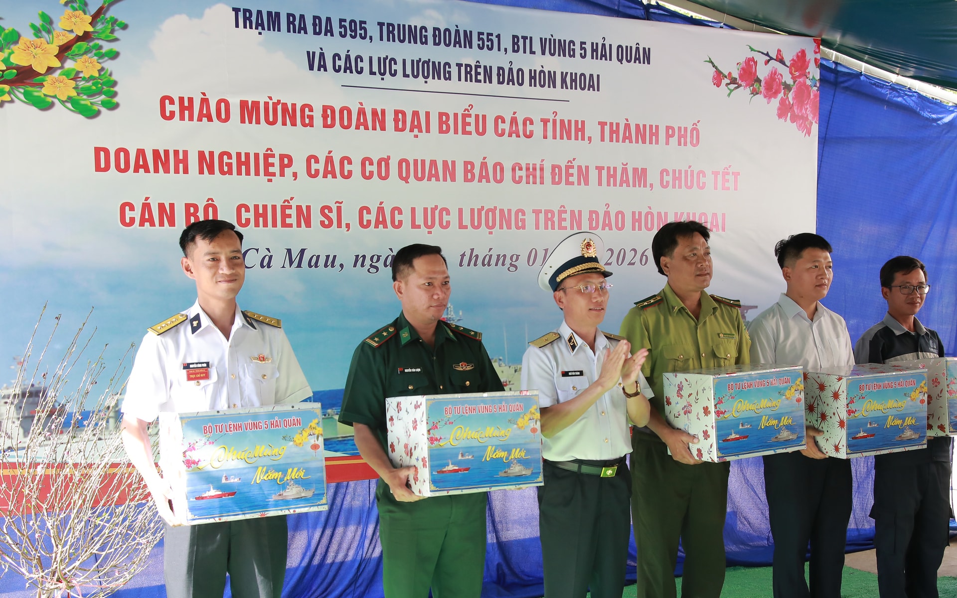 Tiếp tục chuyến thăm, chúc Tết cán bộ, chiến sĩ, các lực lượng và nhân dân trên các đảo thuộc vùng biển Tây Nam, chiều 11/1, đoàn công tác Bộ Tư lệnh Vùng 5 Hải quân tới thăm, tặng quà các lực lượng đang làm nhiệm vụ trên đảo Hòn Khoai (tỉnh Cà Mau).