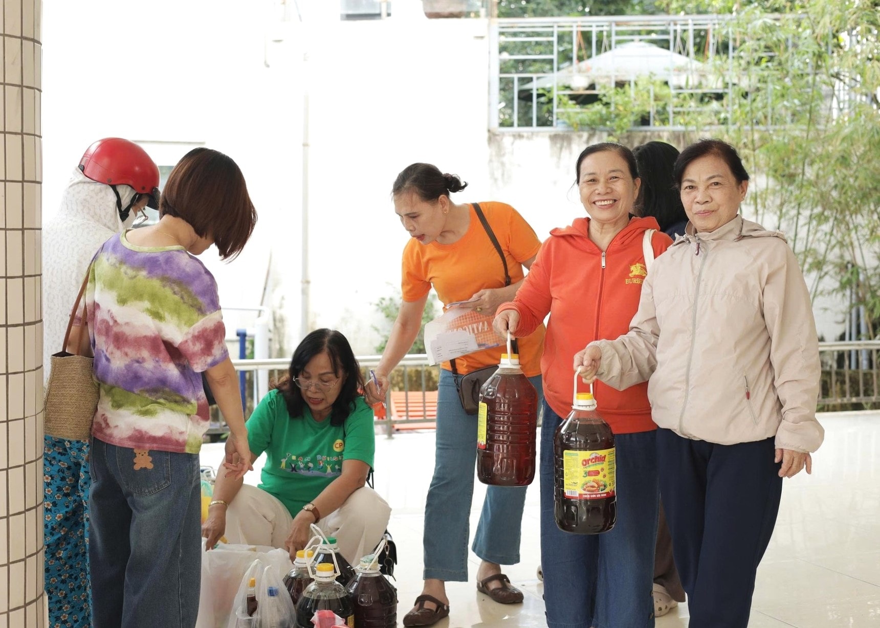 Hội viên phụ nữ mang dầu ăn đã qua sử dụng đến điểm thu đổi.