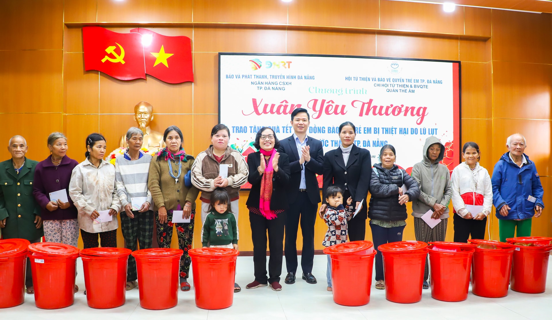 Tổng Biên tập Báo và phát thanh, truyền hình Đà Nẵng Đoàn Xuân Hiếu và Chủ tịch Hội Từ thiện và Bảo vệ quyền trẻ em thành phố Lê Thị Tám trao quà cho các hộ dân