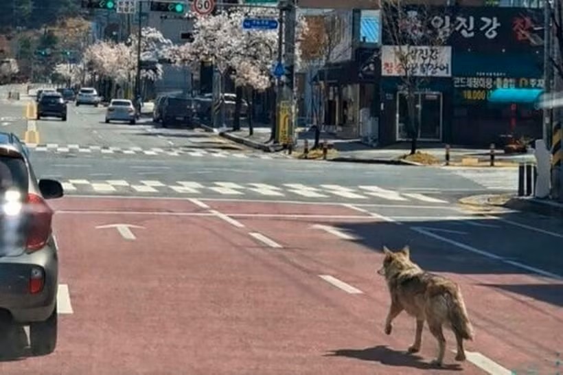 Hình ảnh do truyền thông địa phương Hàn Quốc công bố cho thấy con chó sói nói trên đang đi giữa đường.