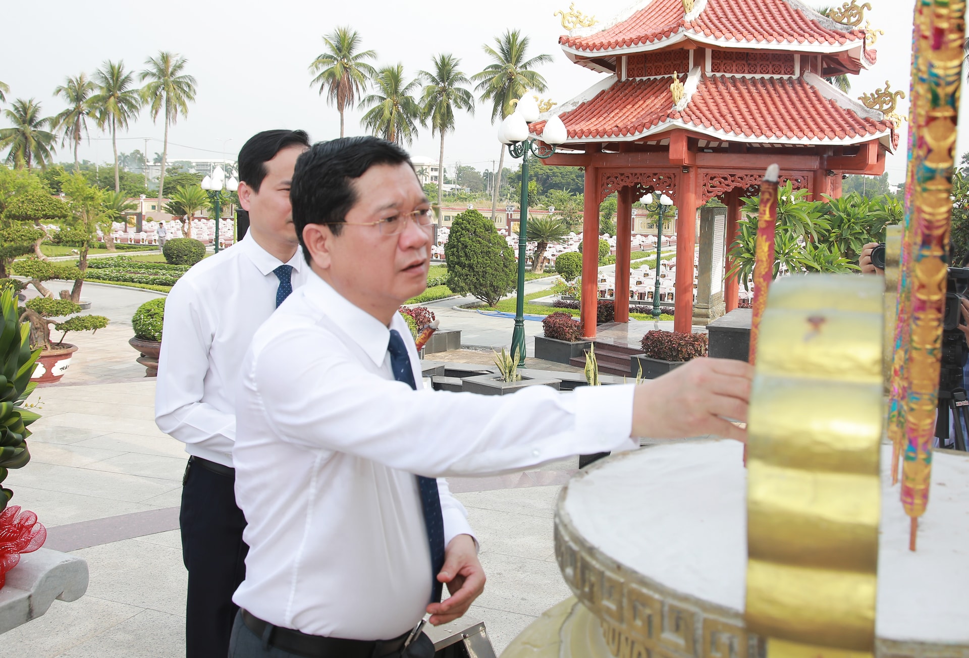 Phó Chủ tịch HĐND thành phố Trần Phước Sơn dâng hương tại Nghĩa trang Liệt sĩ Điện Bàn. Ảnh: ĐẮC MẠNH