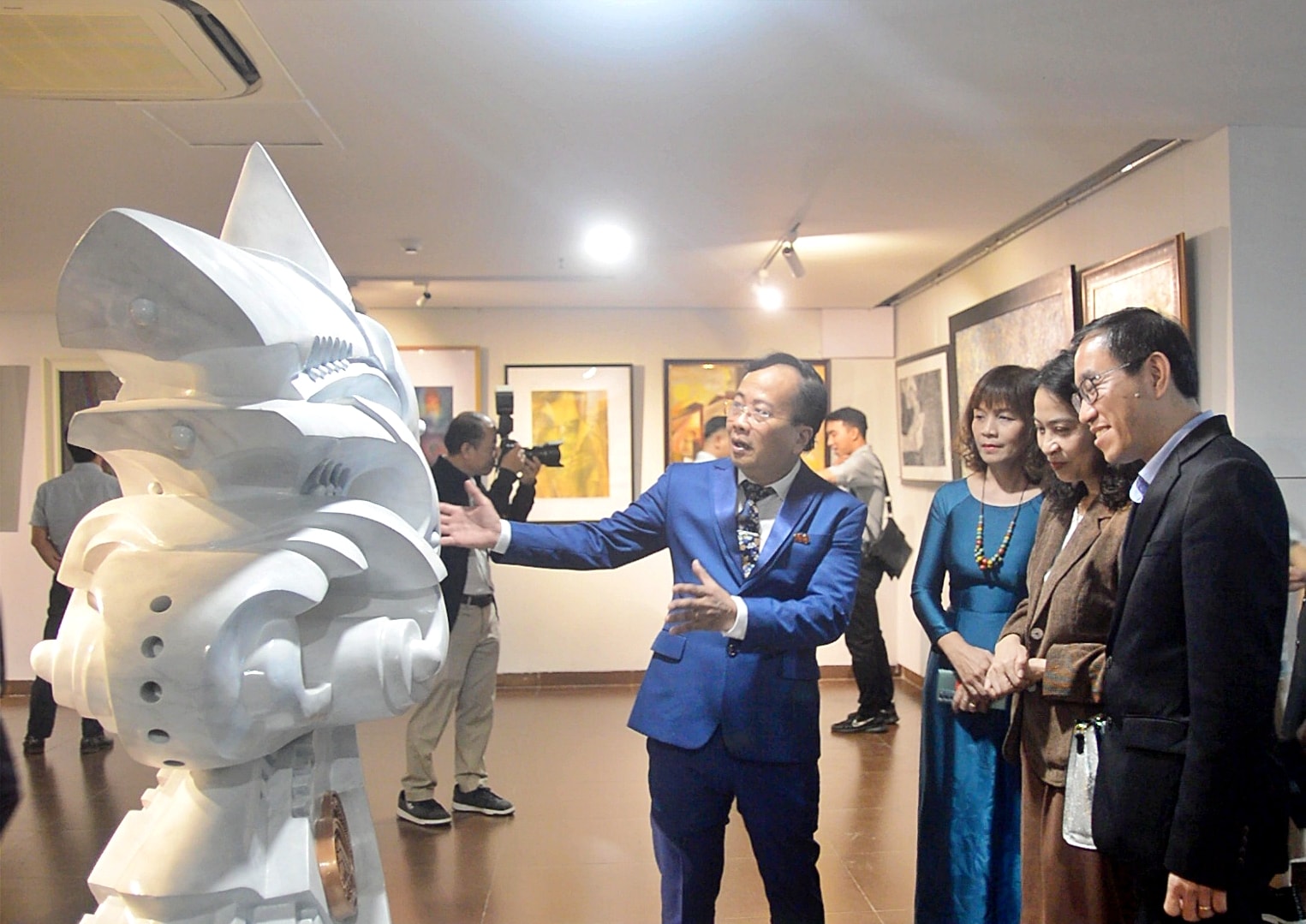 Nhà điêu khắc Đinh Gia Thắng giới thiệu tác phẩm Hợp nhất trong kỷ nguyên mới với đại biểu và khách tham quan