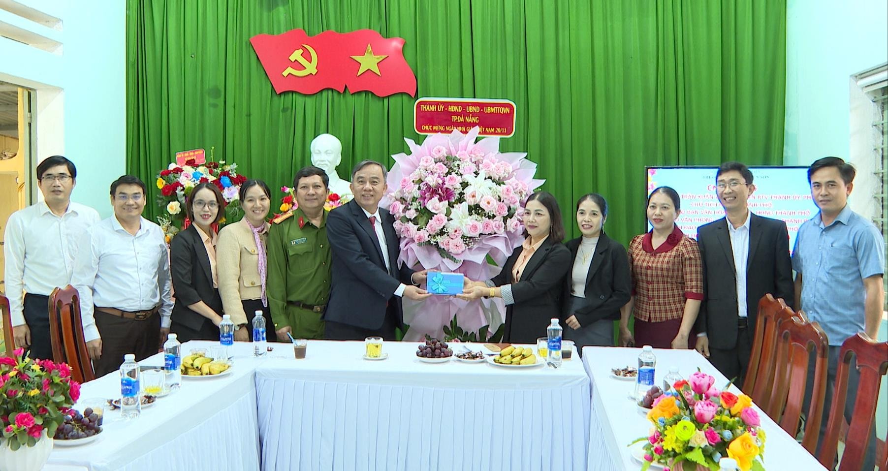 Phó Chủ tịch HĐND thành phố Trần Xuân Vinh (thứ 6, bên trái sang) chúc mừng thầy cô giáo Trường Mẫu giáo Tiên Sơn