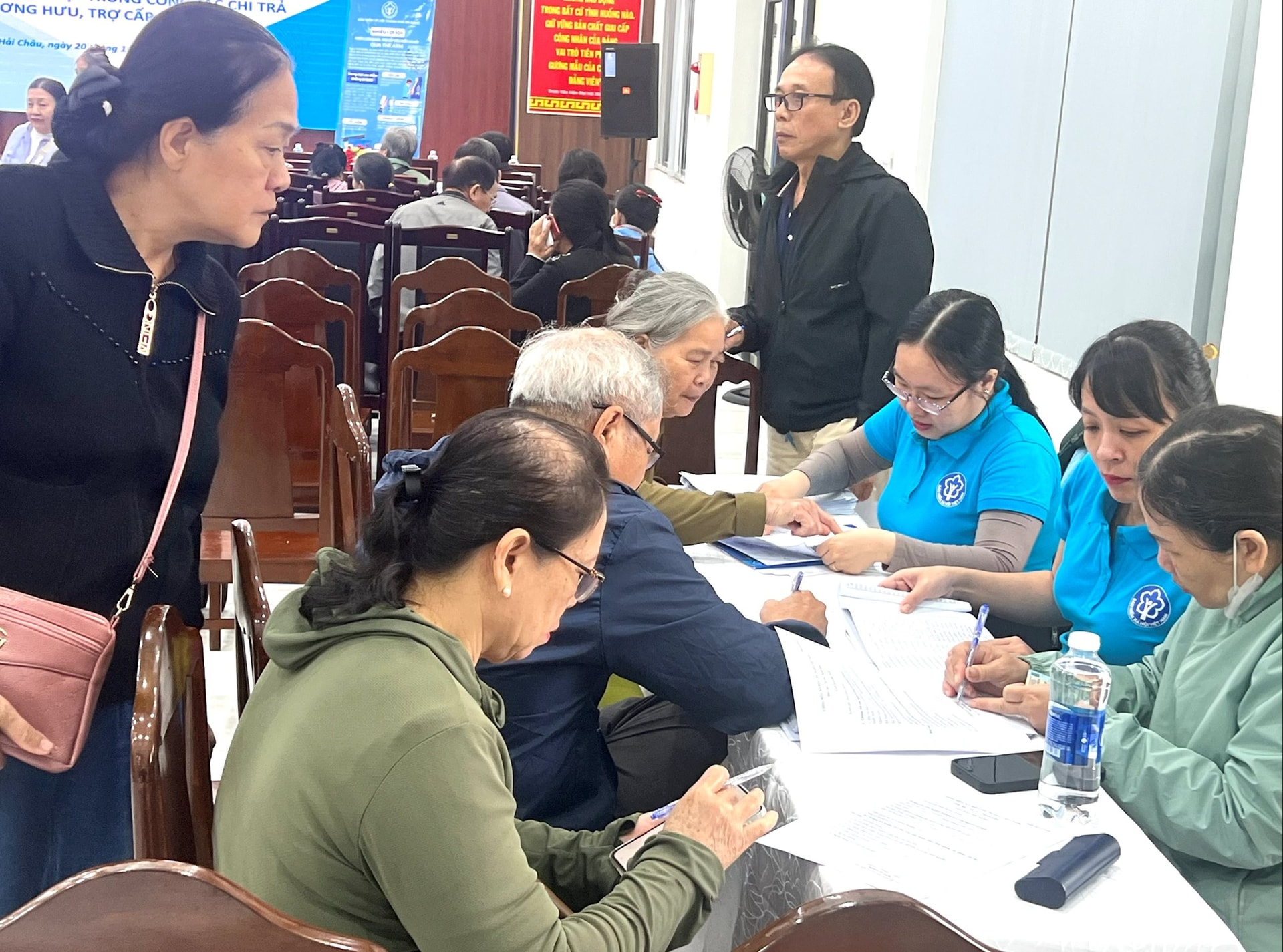 Người dân được cán bộ bảo hiểm xã hội và ngân hàng tư vấn, hỗ trợ, giải thích về các lợi ích khi sử dụng thanh toán không dùng tiền mặt.