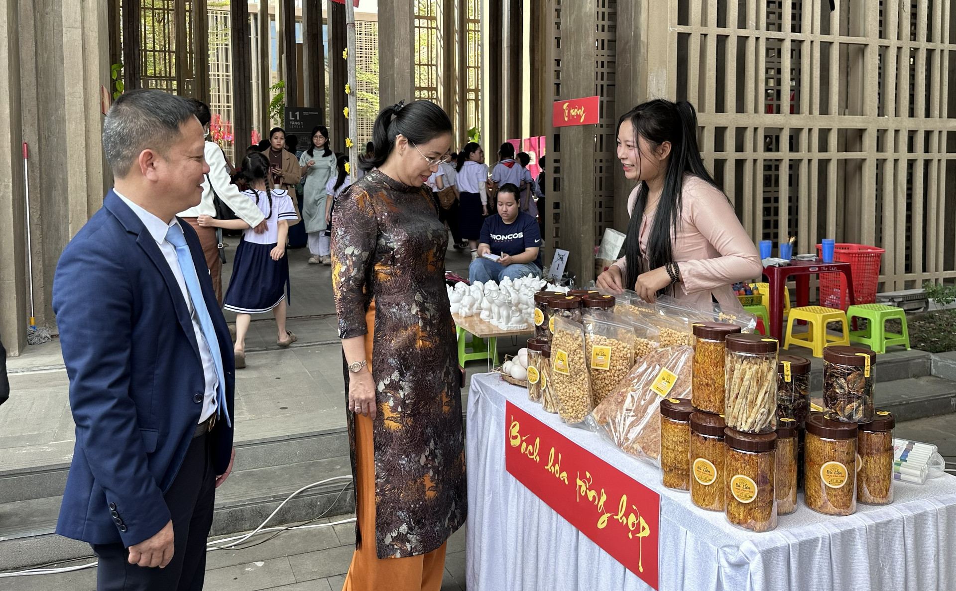 Điểm nhấn của chương trình là không gian chợ Tết truyền thống với các gian hàng ẩm thực dân gian, đồ thủ công, quà Tết, áo dài, cây cảnh.