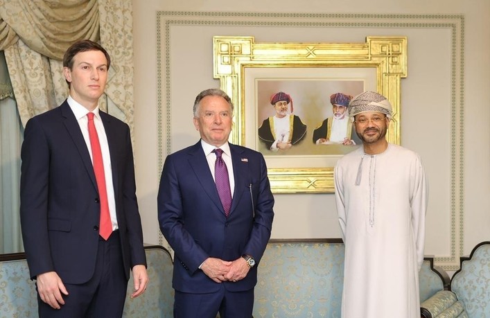 Ngoại trưởng Oman Badr bin Hamad al-Busaidi (phải) và Đặc phái viên của Tổng thống Mỹ Donald Trump, ông Steve Witkoff (giữa), cùng ông Jared Kushner, con rể của Tổng thống Mỹ Donald Trump, tại cuộc gặp ở Muscat, Oman.