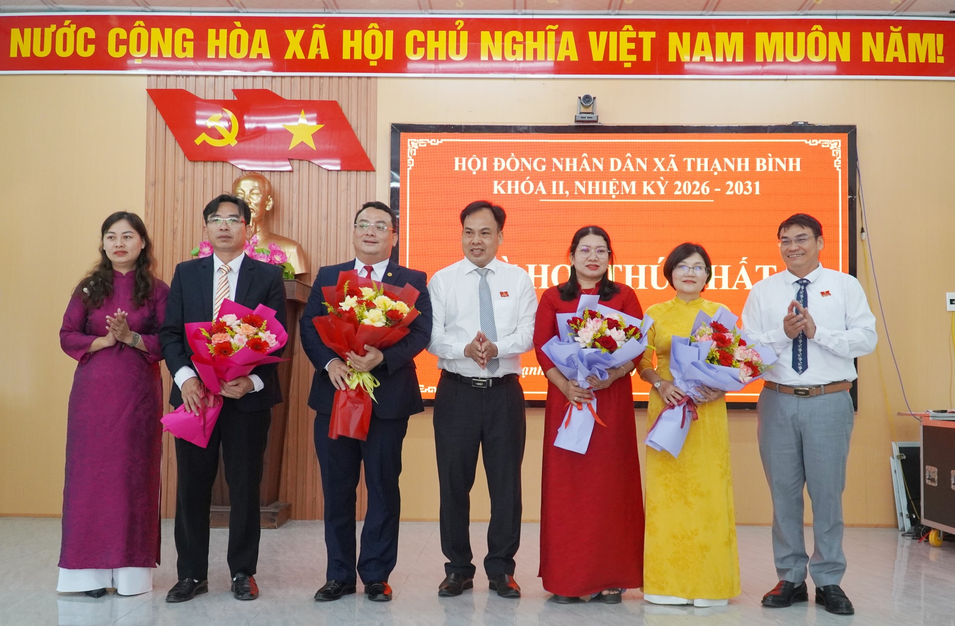 Tại Kỳ họp thứ nhất HĐND xã Thạnh Bình nhiệm kỳ 2026 - 2031, Bí thư Đảng ủy xã Trần Ngọc Tài (thứ 3 bên trái) được tín nhiệm bầu giữ chức danh Chủ tịch HĐND xã