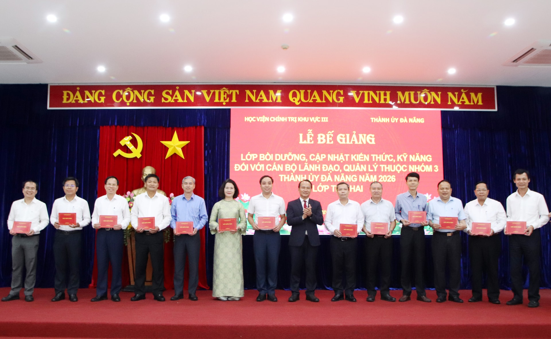 Phó Bí thư Thường trực Thành ủy Nguyễn Đình Vĩnh trao chứng nhận và chúc mừng các học viên hoàn thành khóa bồi dưỡng.