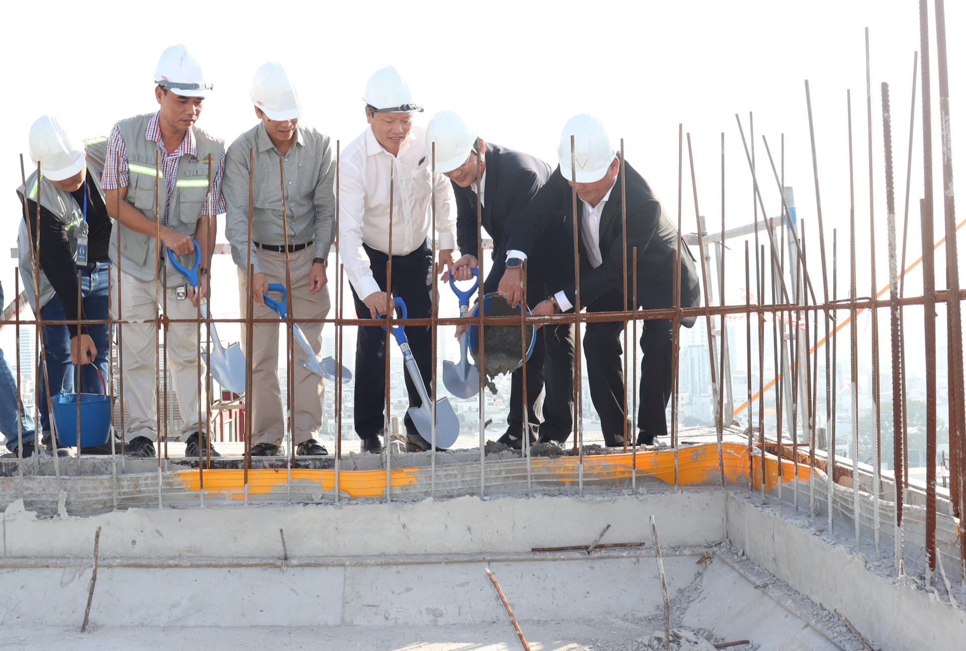 Lãnh đạo Sở Xây dựng, địa phương và chủ đầu tư thực hiện nghi thức cất nóc 2 khối nhà ở xã hội.
