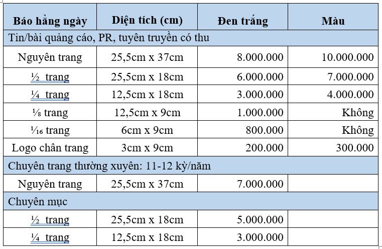- Đơn vị tính: VNĐ cho 1 kỳ/lần đăng (Đã bao gồm thuế