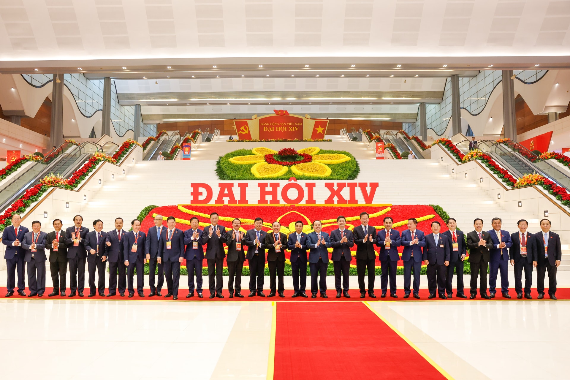 Bí thư Thành ủy Đà Nẵng Lê Ngọc Quang (thứ 11, bên trái sang) và các đại biểu tham dự Đại hội lần thứ XIV của Đảng. Ảnh: NGỌC PHÚ