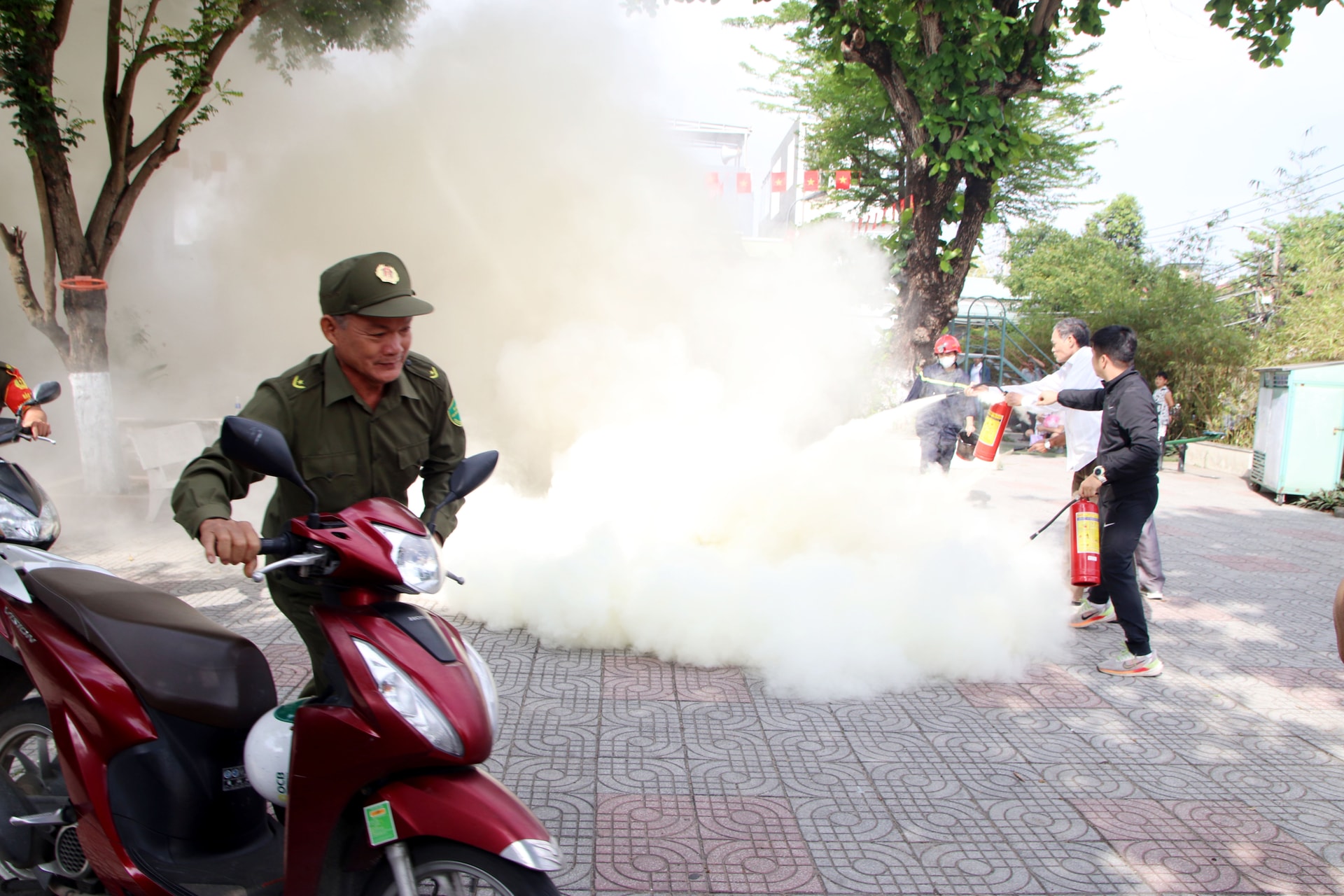 Các lực lượng phối hợp diễn tập chữa cháy và cứu hộ tại điểm bầu cử