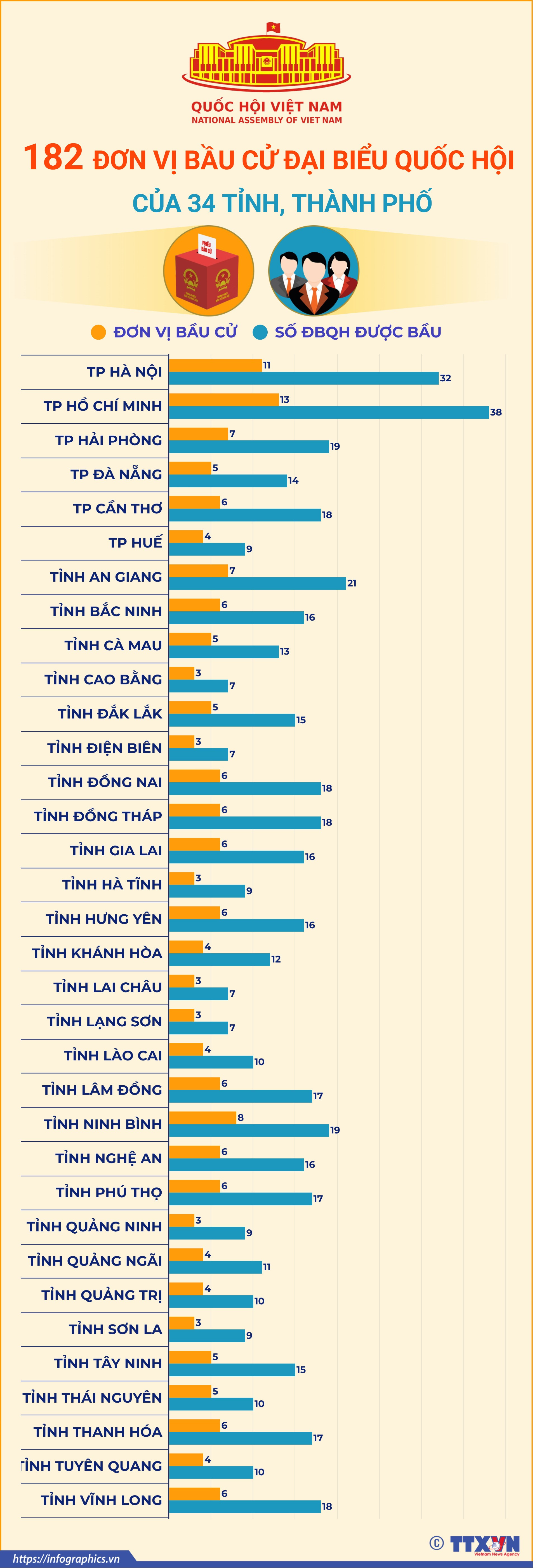 Nghị quyết số 85/NQ-HĐBCQG ngày 15/12/2025 do Chủ tịch Quốc hội Trần Thanh Mẫn - Chủ tịch Hội đồng Bầu cử Quốc gia đã ký ban hành nêu rõ số đơn vị bầu cử, danh sách các đơn vị bầu cử và số lượng đại biểu Quốc hội được bầu ở mỗi đơn vị bầu cử của 34 tỉnh, thành phố.