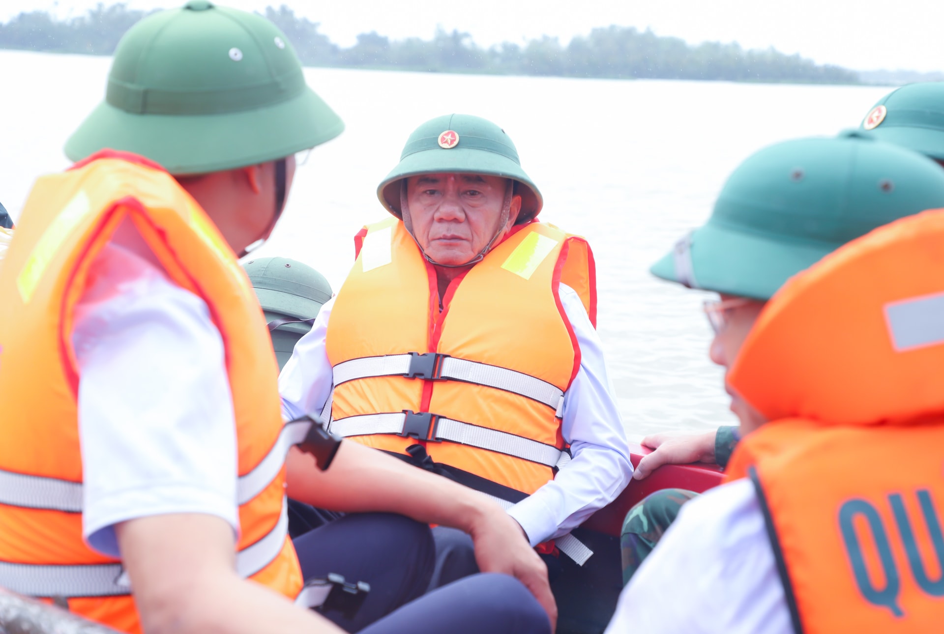 Thường trực Ban Bí thư Trần Cẩm Tú đi ca nô vào vùng lũ tại thôn Trà Đóa, xã Thăng An.