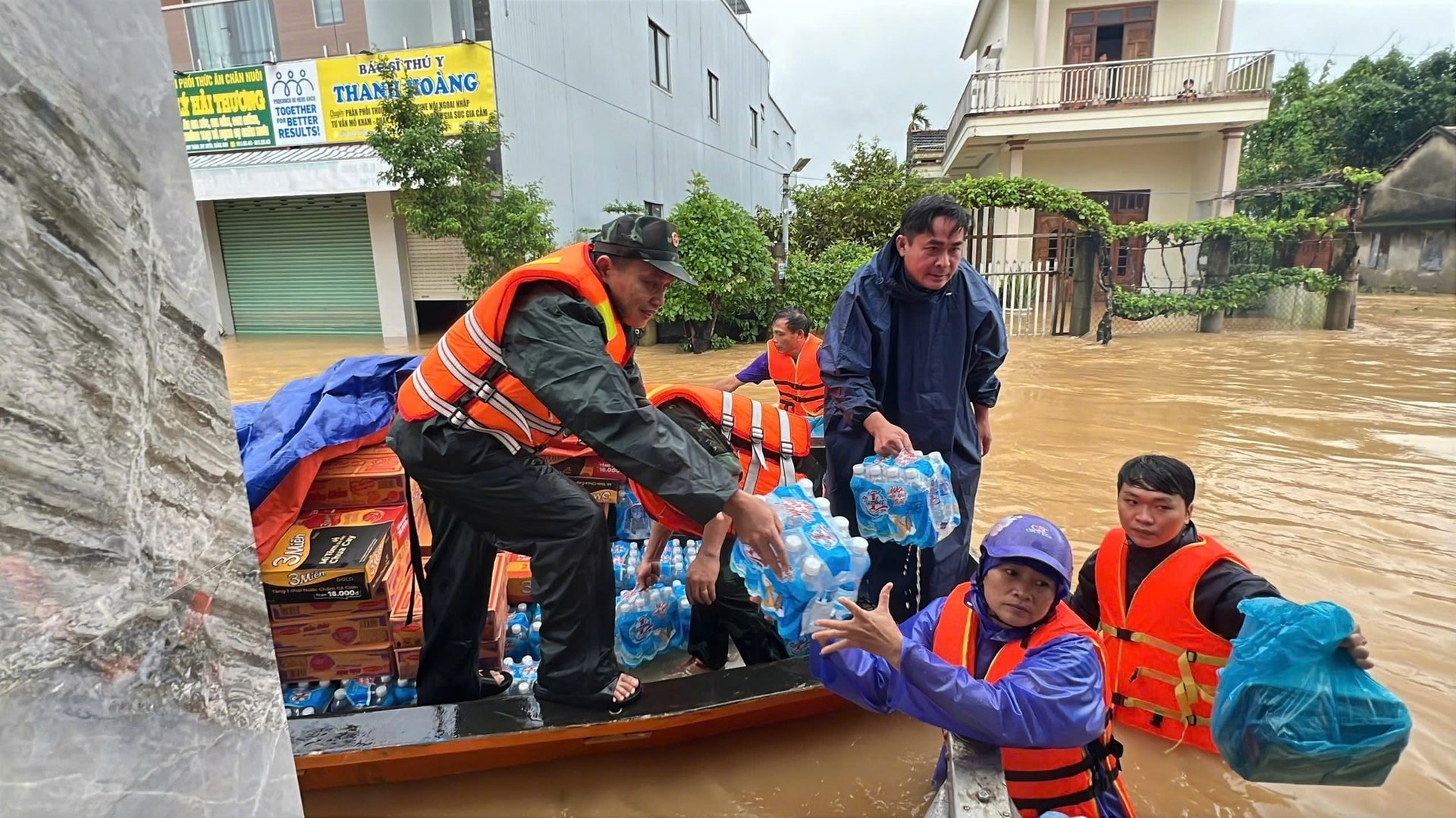 Hỗ trợ nhu yếu phẩm thiết yếu tiếp tế cho các gia đình bị ngập sâu tại xã Duy Nghĩa.